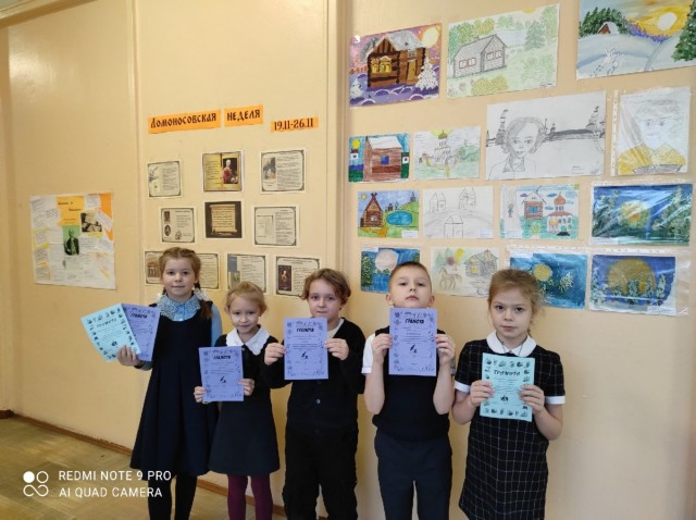 среди 8-9 классов. 1 место – Попова Вероника 9а, 2 место– Куцепалова Елизавета 9а 3 место – Марихина Алевтина 9б среди 10-11 классов ребята набрали одинаковое количество балов 1 место – Мартынова Татьяна 11а, Назарова Юлия 11а, Кованов Данил 10а В течение недели всё обучающиеся нашей школы участвовали в квестах и играх, смотрели фильмы о нашем великом земляке, а ученики начальной школы подготовили рисунки на выставку "Родина Ломоносова глазами детей" |